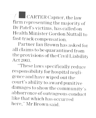 Carter Capner, the law firm representing the majority of Dr Patel’s victims, has called on Health Minister Gordon Nuttall to fast-track compensation.